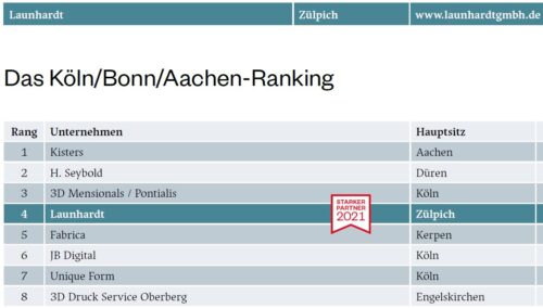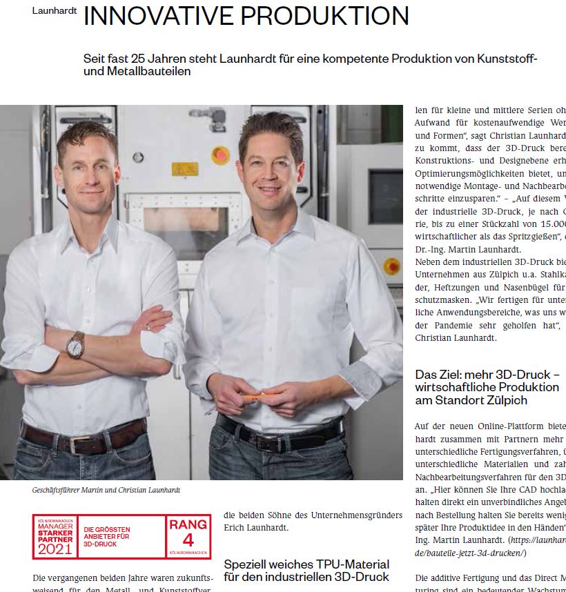 The trade magazine Cologne-Bonn-Aachen Manager listed the largest suppliers of industrial 3D printing in its April 2021 issue. Launhardt took fourth place in this ranking, underscoring the strong growth in the field of additive manufacturing. You can find out more in the Cologne/Bonn/Aachen Manager magazine or at the following link.
